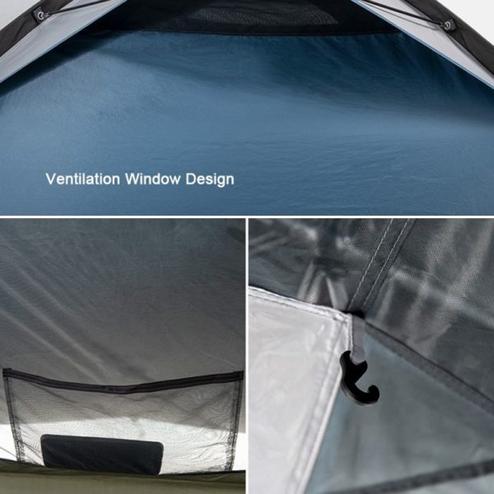پنجره های چادر می تواند توسط گیرههای مخصوص باز و بسته شود و طناب های حمایت و میخهای فلزی چادر را در برابر وزش باد حفظ می کنند.