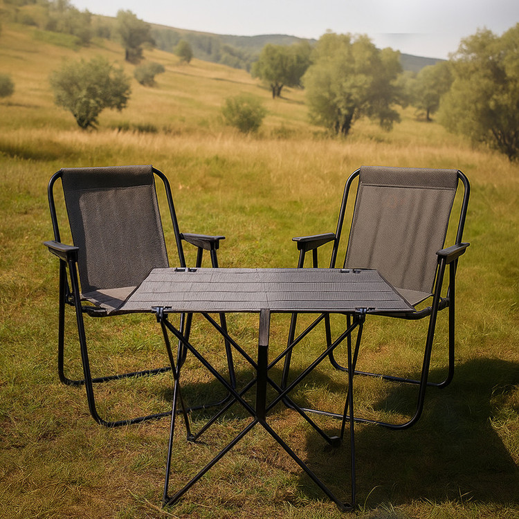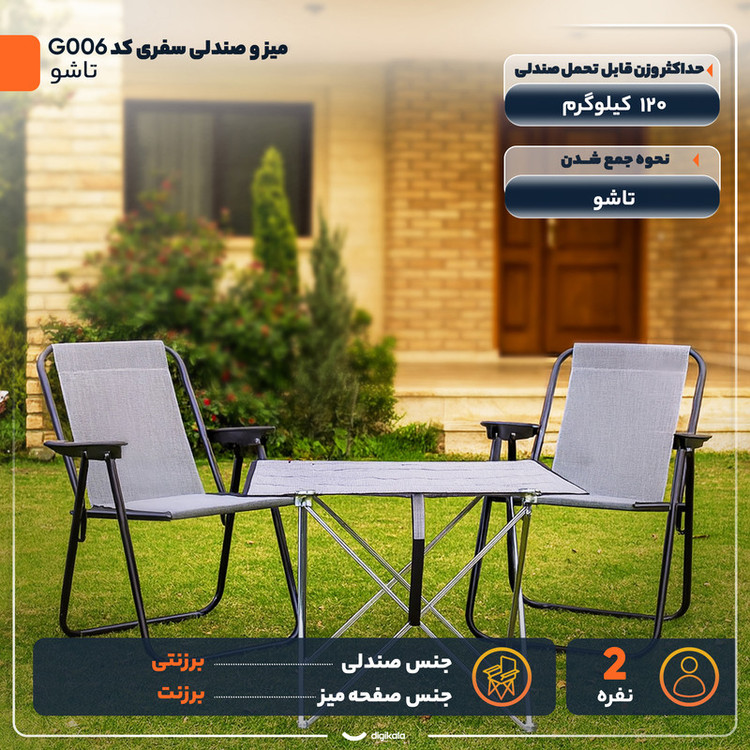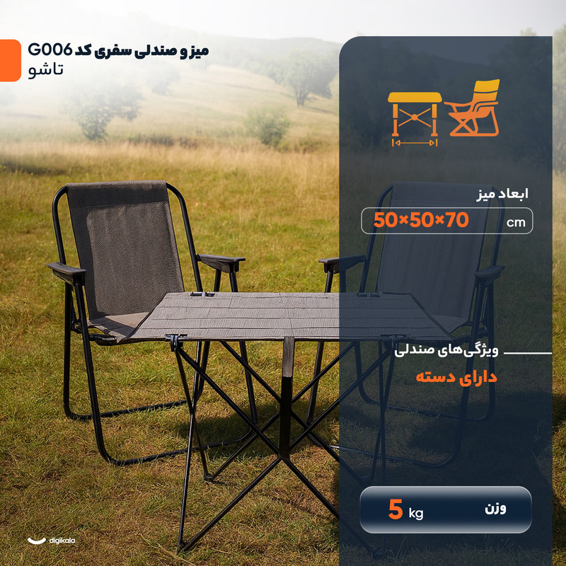 میز سفری تاشو با پایه آهنی دارای ابعاد باز ۷۰×۵۰×۵۰ سانتیمتر و ابعاد بسته ۵×۵×۷۵ سانتیمتر است. تحمل وزن سطح میز بین ۵۰ تا ۶۵ کیلوگرم میباشد. ابعاد صندلی در حالت بسته ۶۰×۶۰×۸ سانتیمتر بوده و تحمل وزن آن تا ۱۲۰ کیلوگرم است.