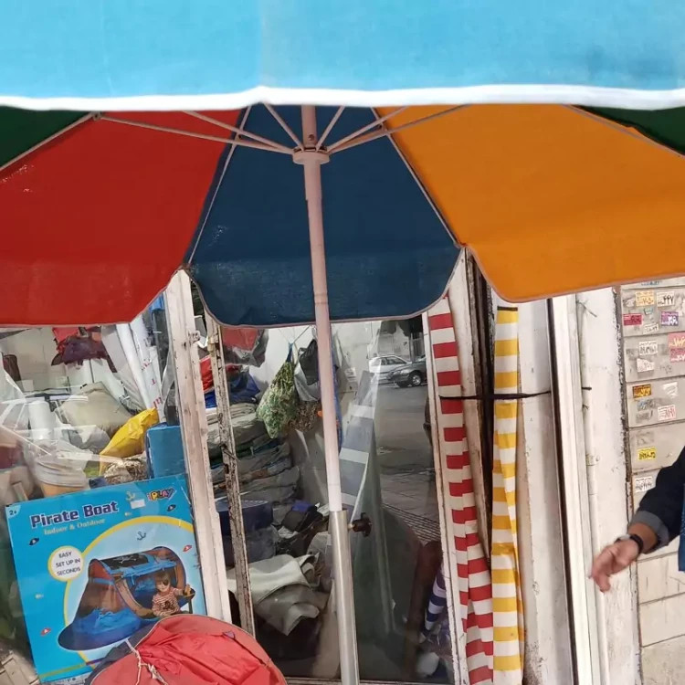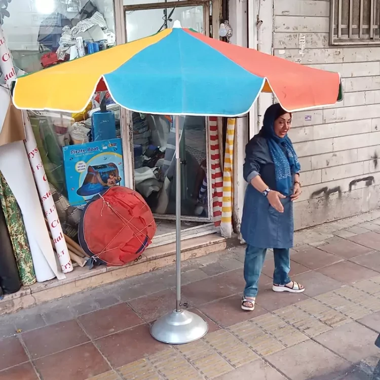 چتر سایبان از جنس برزنت و اسکلت آهنی بسیار محکم و پایه وسط که سایه آن بسیار خنک میباشد ضد آب نیست و برزنتی مناسب آفتاب است دارای یک لوله برای تنظیم ارتفاع و یک پایه برای ایستادن کف زمین است تا شو بوده و در صندوق ماشین قابل حمل است